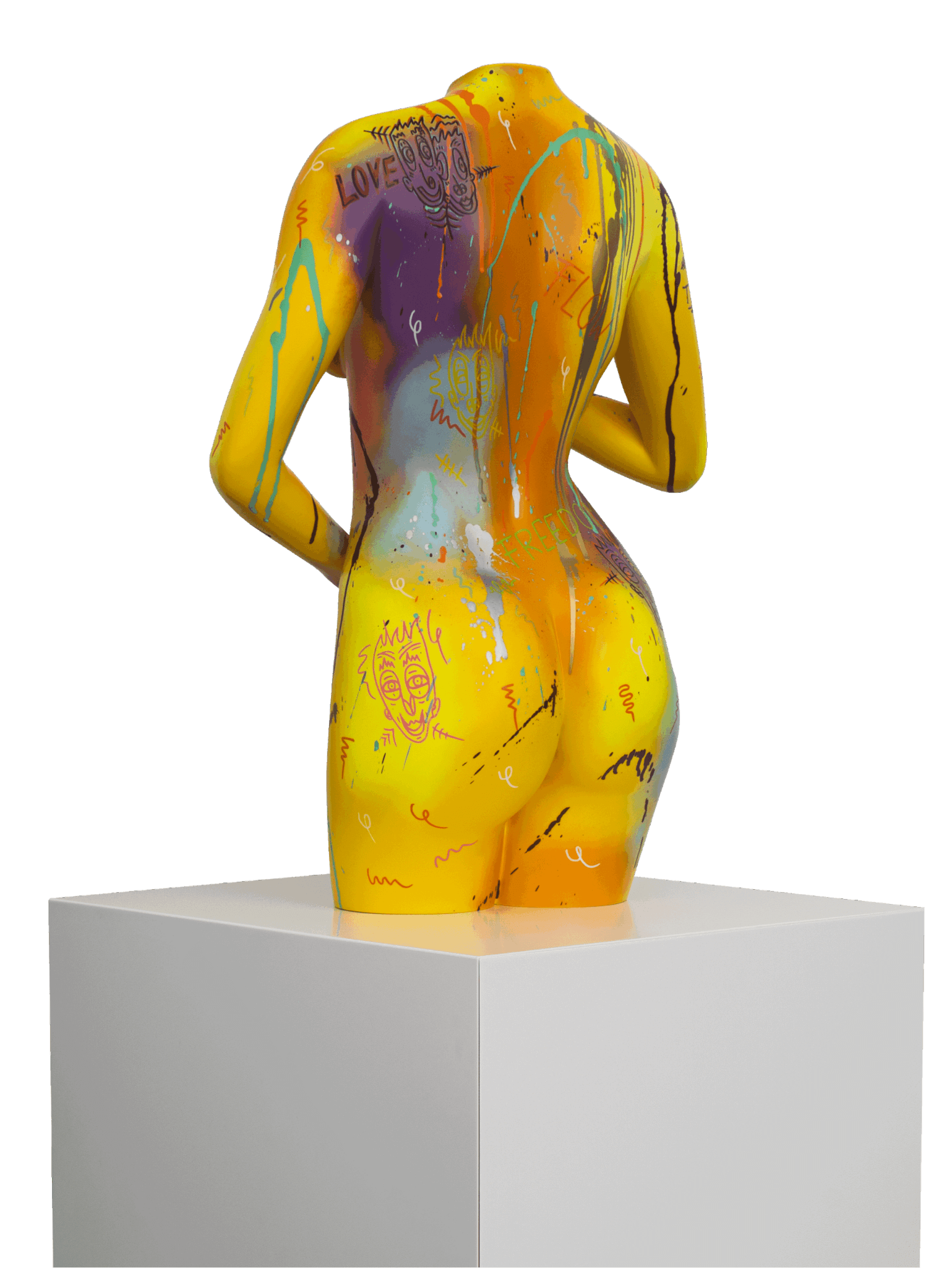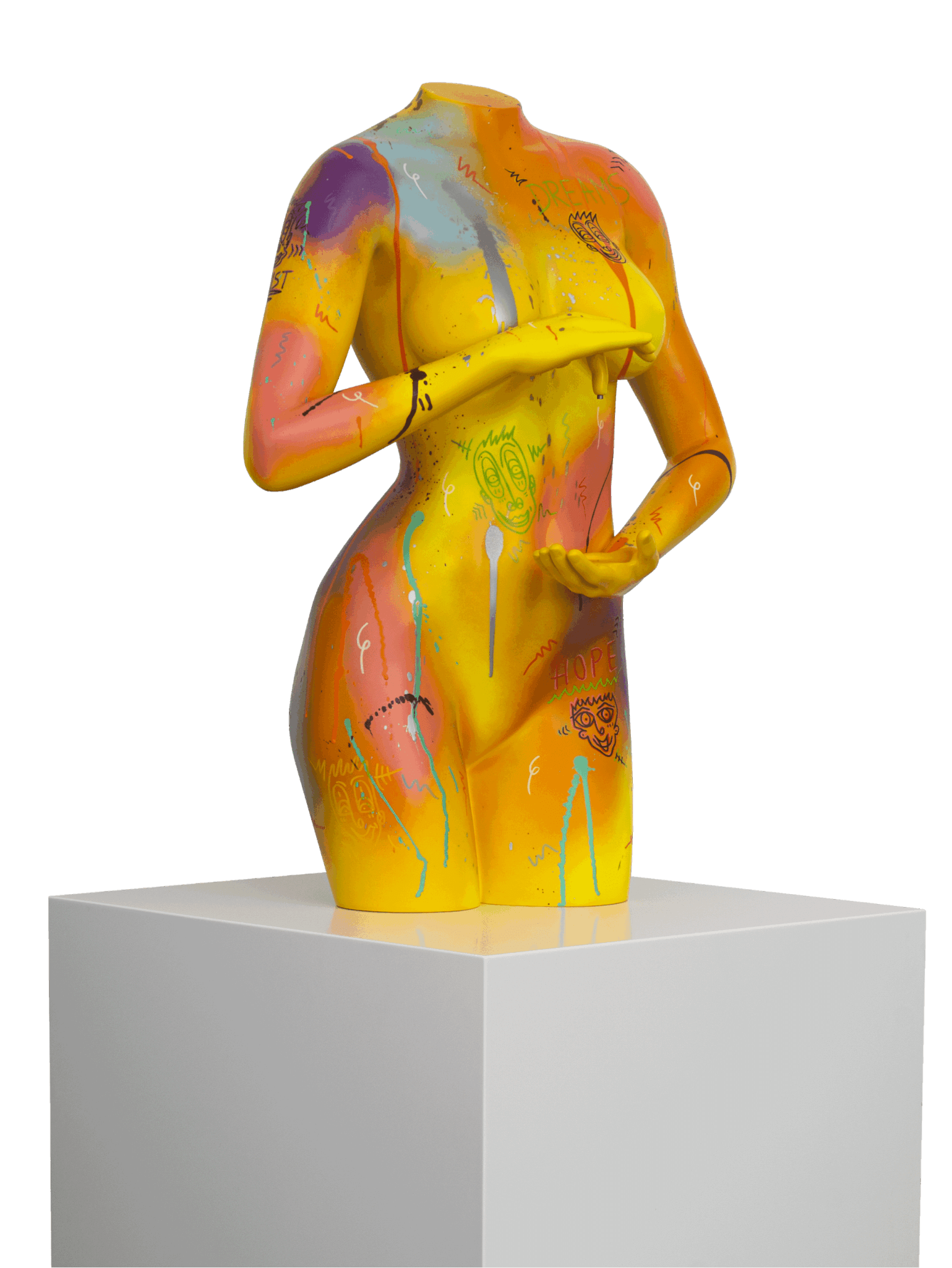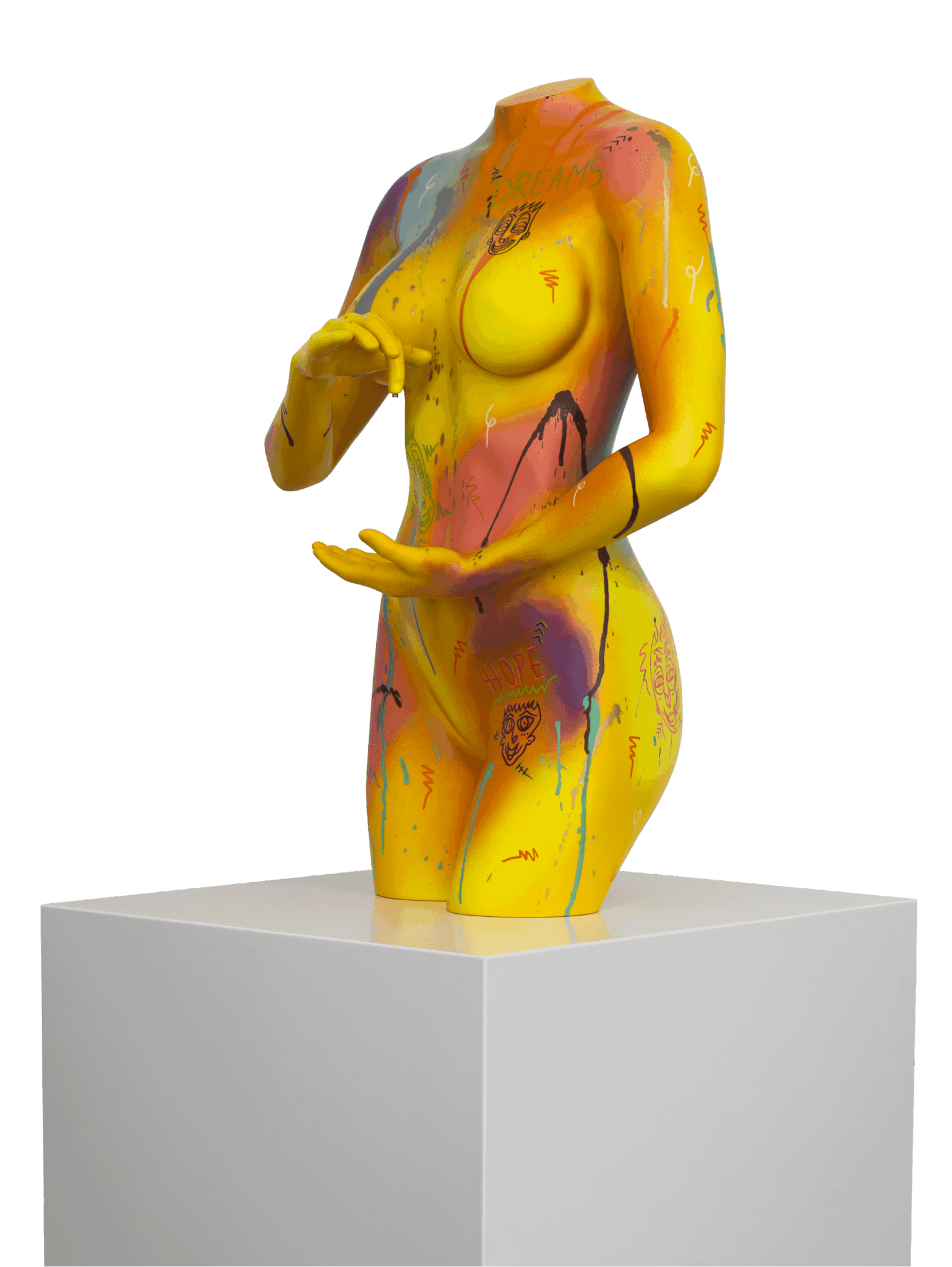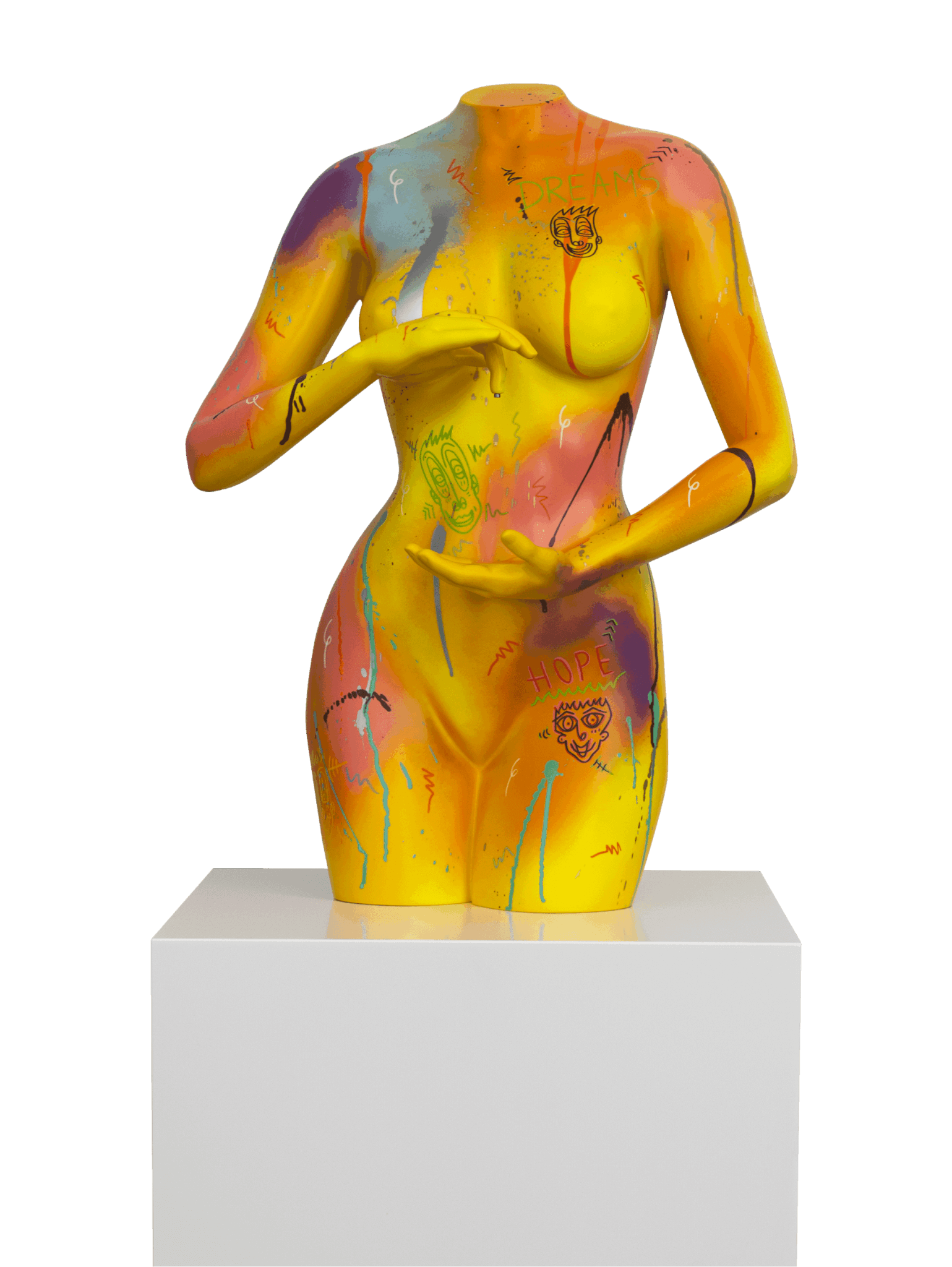 “Oracle of Joy” celebrates the most powerful human states: hope, love, and freedom. The bright colors merge with Kuranyi’s iconic characters to form a pulsating field of energy. This sculpture represents emotional healing, joie de vivre, and the inner sun that every soul carries within. A colorful oracle that radiates optimism and envelops spaces in light, freedom, and lightness.