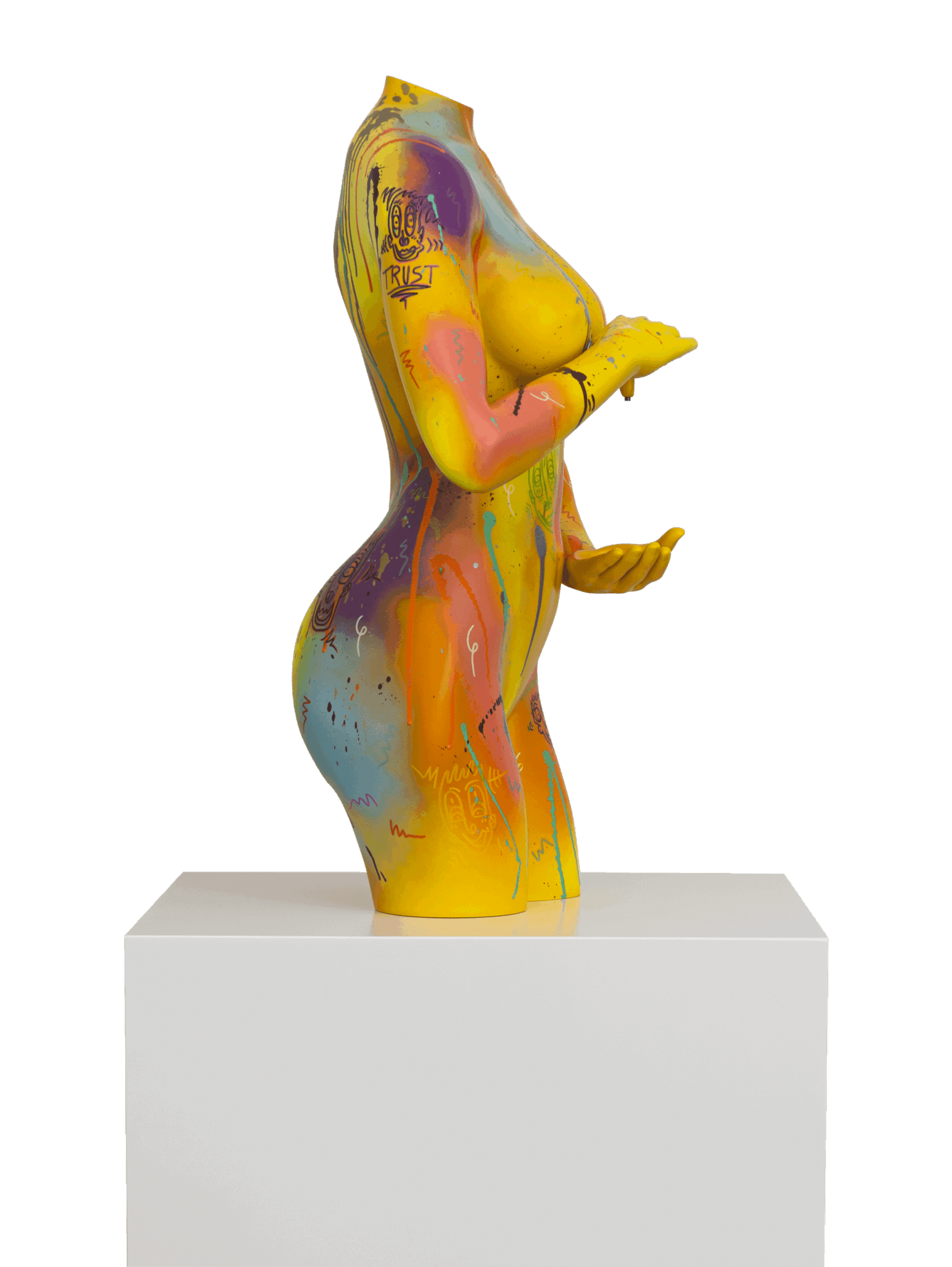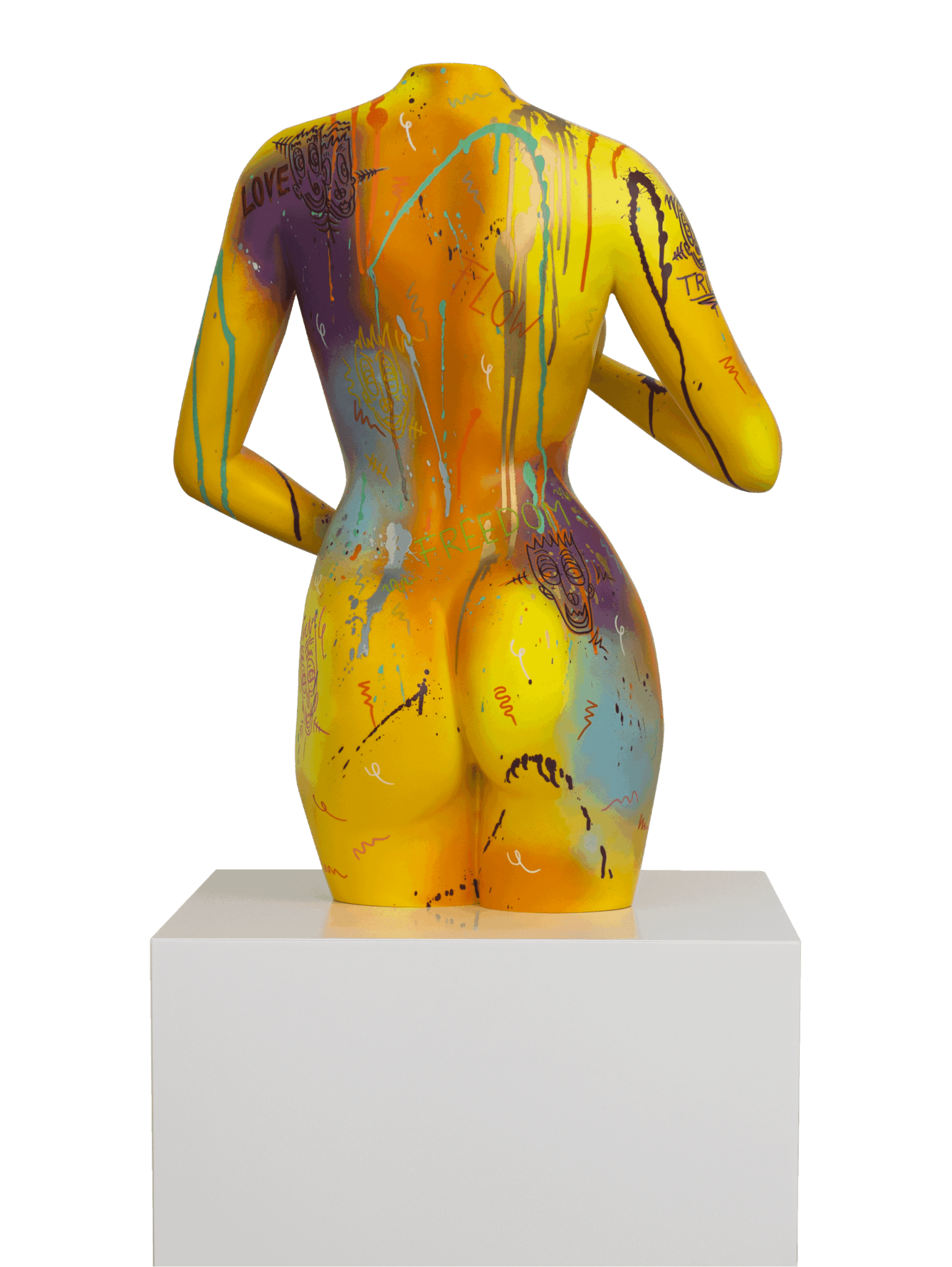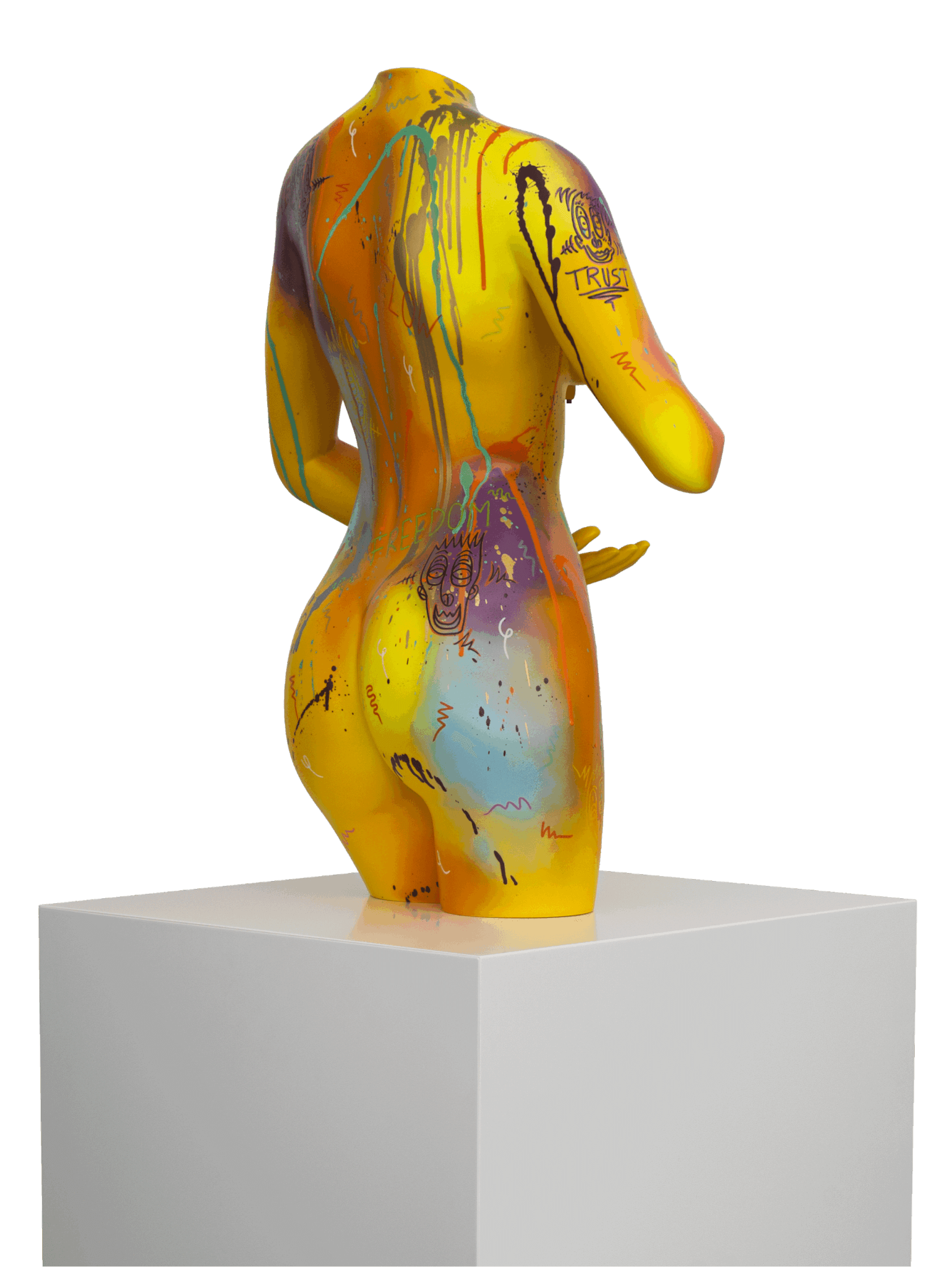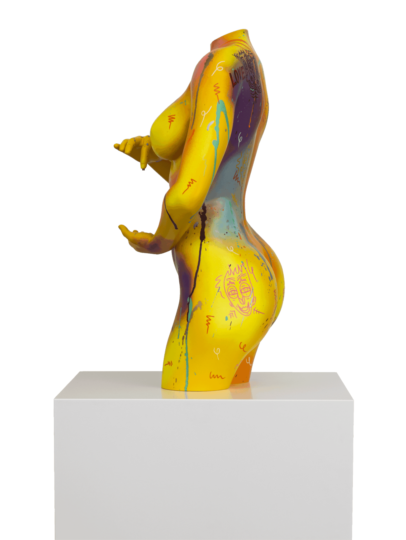 “Oracle of Joy” celebrates the most powerful human states: hope, love, and freedom. The bright colors merge with Kuranyi’s iconic characters to form a pulsating field of energy. This sculpture represents emotional healing, joie de vivre, and the inner sun that every soul carries within. A colorful oracle that radiates optimism and envelops spaces in light, freedom, and lightness.
